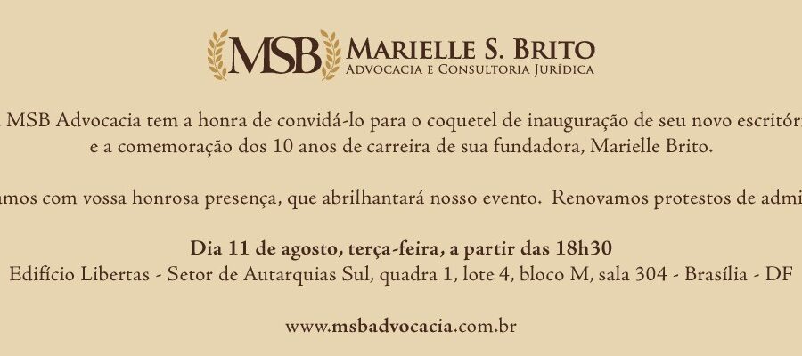 [:pt] A MSB Advocacia tem a honra de convidá-lo para o coquetel de inauguração de seu novo escritório e a comemoração dos 10 anos de carreira de sua fundadora, Marielle Brito. Contamos com vossa honrosa presença, que abrilhantará...
